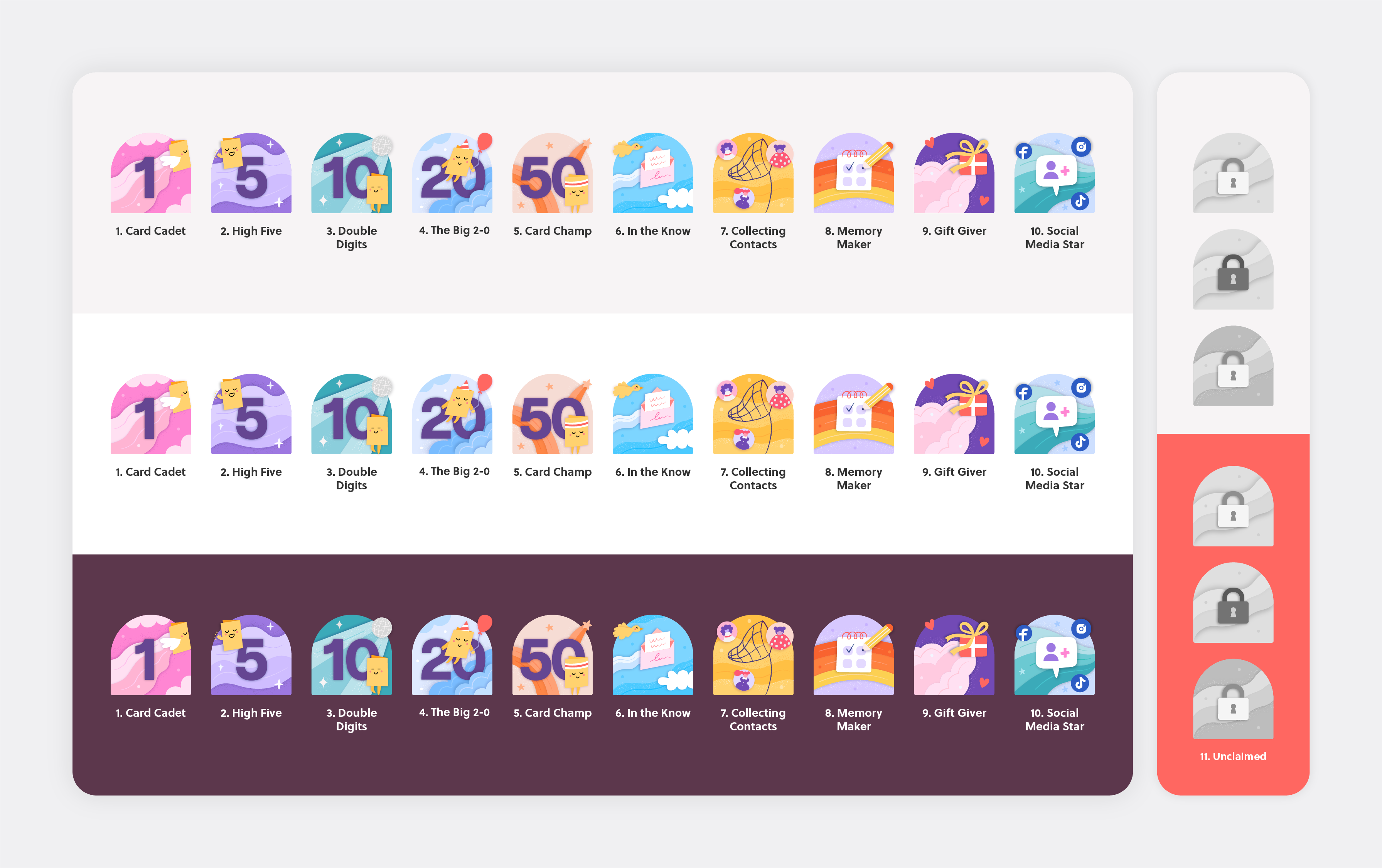 American Greetings is a greeting card and digital greetings platform. Working with the Digital Design Director, I led the art direction and creation of a system of badges for their online membership platform. The gamified member experience aims to encourage engagement and repeat usage and includes milestones, seasonal achievements, new features' exploration, and mobile challenges.