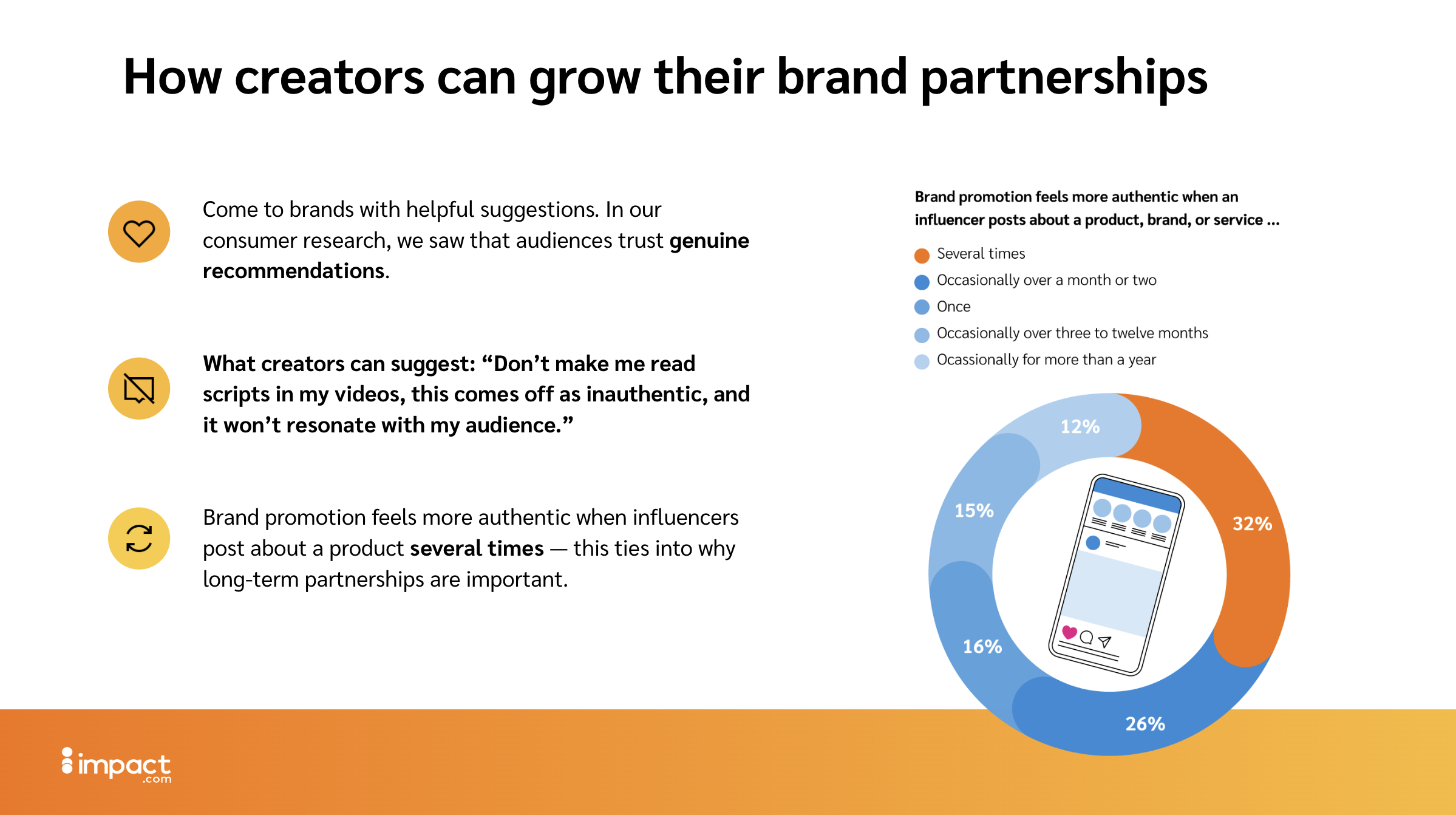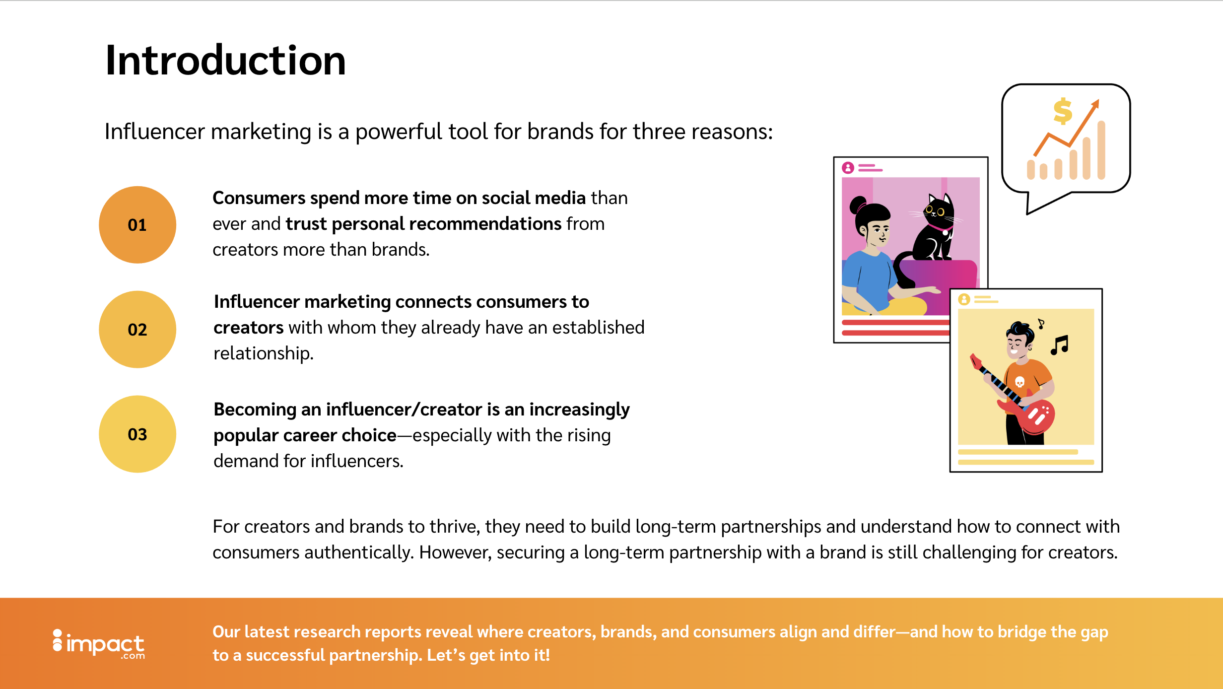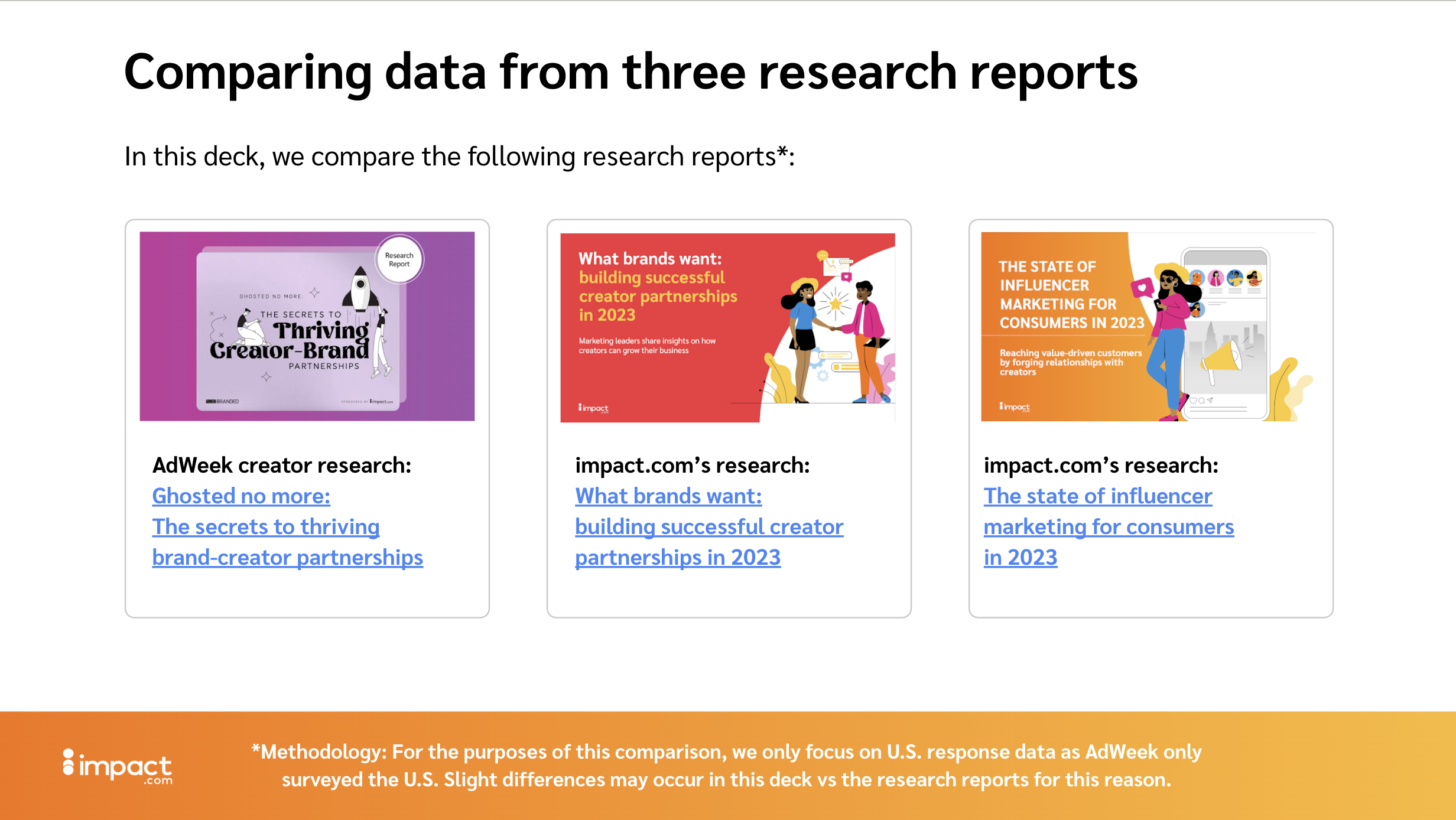 impact.com is a partnerships management platform. Working with the Content Director and the internal brand and marketing teams, I designed reports, decks, and campaign materials within an established brand system, translating complex data into clear visual communication.